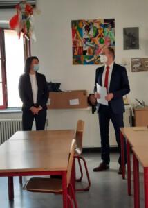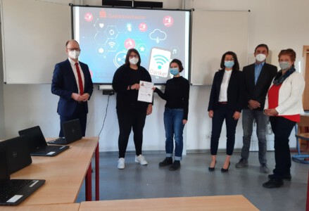 Die Übergabe der Fördermittel erfolgte durch den Gebietsleiter Nord der Saalesparkasse, Herr Grund, und die Filialleiterin der Saalesparkasse Wettin, Frau Wesser. Herr Grund betonte in seiner Ansprache: „Wir sind froh helfen zu können, da wir in der letzten Zeit gemerkt haben, dass es im Bereich der Digitalisierung nur gemeinsam geht. Von daher leisten wir diesen Beitrag zum WLAN-Ausbau am Burg-Gymnasium von Herzen.“