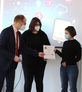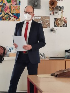 Die beiden Vertreterinnen der Schülerschaft Hanna Liebrecht und Hanna Mauf freuten sich über die guten Neuigkeiten und berichteten von Ihren bisherigen Erfahrungen mit dem Hybridunterricht, also dem Streamen des Unterrichtes aus dem Klassenzimmer für die Schüler*innen, die zu Hause lernen müssen. „Die Möglichkeiten für den Hybridunterricht werden dadurch größer“, prophezeit Hanna Liebrecht. Hanna Mauf fügt hinzu: „Wir wissen, wie viel uns diese Möglichkeit bringt und haben gemerkt, dass wir uns auch darum kümmern müssen, damit wir es nutzen können.“
